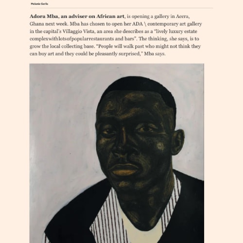 ADORA MBA, AN ADVISER ON AFRICAN ART, IS OPENING A GALLERY IN ACCRA, GHANA NEXT WEEK.