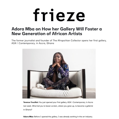 ADORA MBA ON HOW HER GALLERY WILL FOSTER A NEW GENERATION OF AFRICAN ARTISTS TERENCE TROUILLOT, FRIEZE MAGAZINE OCTOBER 22, 2020 FULL ARTICLE RelatedAdora Mba’s ADA Contemporary is reimagining the Art Scene: From Accra to the WorldAugust 22, 2025CULTURED Magazine : Inaugural Young Dealers ListJune 17, 2025ARTFORUM – The Alchemy of Colour and MatterApril 18, 2025