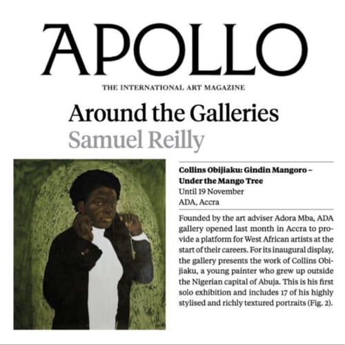 AROUND THE GALLERIES SAMUEL REILLY, APOLLO NOVEMBER 2, 2020 RelatedAdora Mba’s ADA Contemporary is reimagining the Art Scene: From Accra to the WorldAugust 22, 2025CULTURED Magazine : Inaugural Young Dealers ListJune 17, 2025ARTFORUM – The Alchemy of Colour and MatterApril 18, 2025