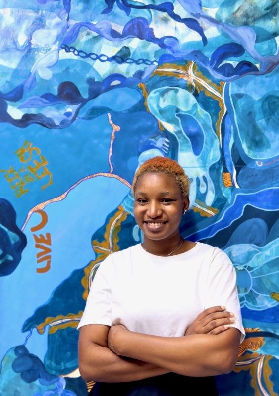 The subjects of my paintings generate a warped feeling that also signifies limitless flow. They directly channel the state in which my family finds ourselves: having to wake up in a dream-like state at midnight till dawn to store and preserve water, and the sleepiness that clouds your vision with dizzy spells. Ultimately, all the focus on water shortages in my community affected my life and made me and others nocturnal for the past two decades.- Araba Opoku