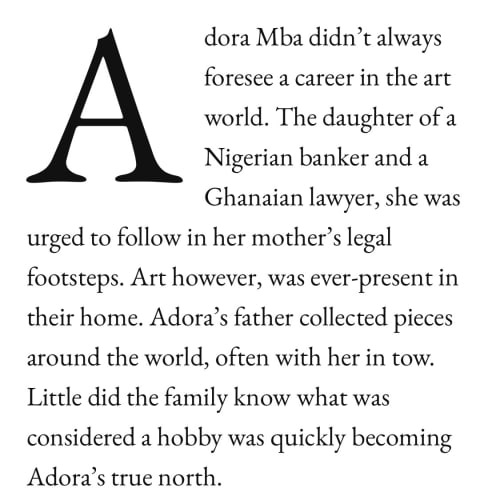 DOWN TO A FINE ART HANNAH MAGAZINE MARCH 4, 2021 FULL ARTICLE RelatedAdora Mba’s ADA Contemporary is reimagining the Art Scene: From Accra to the WorldAugust 22, 2025CULTURED Magazine : Inaugural Young Dealers ListJune 17, 2025ARTFORUM – The Alchemy of Colour and MatterApril 18, 2025
