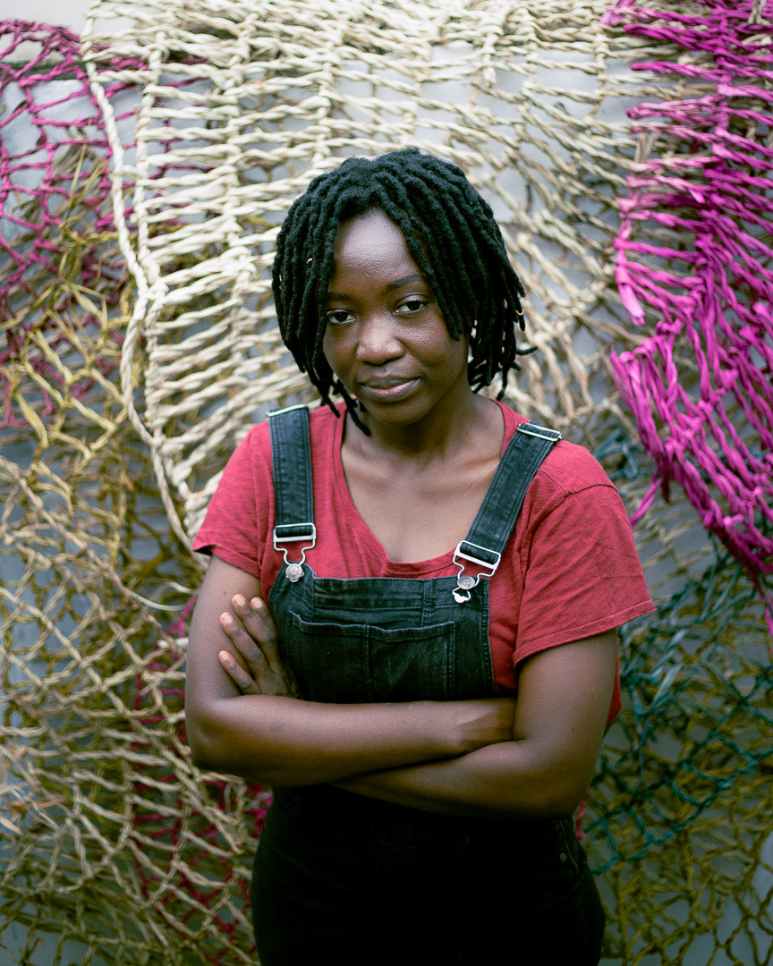 Material metaphors and vibrant aesthetic forms characterize Ankomah’s installations, which she perceives to be archival objects which have passed through various boarders, cultures, processes, different owners, and many hands both named and anonymous. The installed forms are reassembled baskets, manipulated through weaving and stitching, thus transforming the baskets into new tapestry and intricate designs. The installations form entangled and complex visual imageries, concocting enigmas, and curiosity.