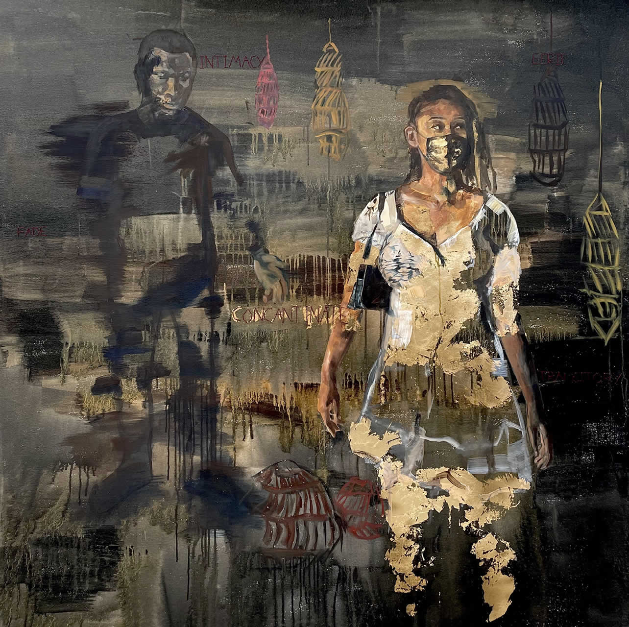 In and out of time, disrupts the way we think about temporality and quantified narrative experiences, generating subjective progression through moments and scenes. The imitation gold leaf on the canvas surface of the majority of Prempeh’s work signifies the inevitable passing of time and transitory nature of existence. Gradually, the gold leaf deteriorates, and changes colour, and loses its, vibrancy, and aura. The introduction of fabric transforms the surface of the canvas into a three-dimensional state and the sand and other materials into a quasi-installation environment. Prempeh’s work also includes words in the context of self-identification and definition, with excerpts taken from her diary or other literary materials.