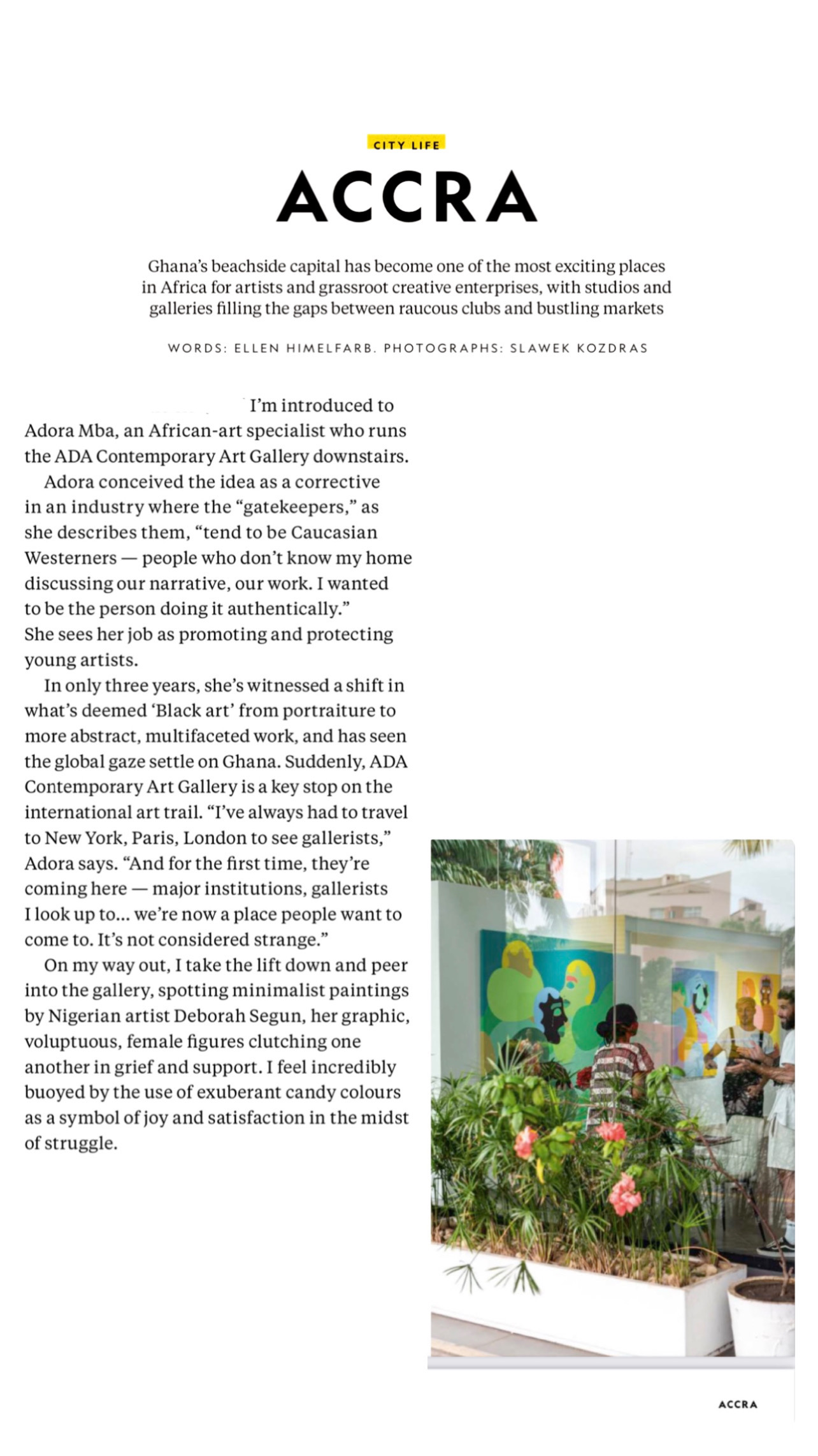 NATIONAL GEOGRAPHIC TRAVELLER APRIL 2023 RelatedAdora Mba’s ADA Contemporary is reimagining the Art Scene: From Accra to the WorldAugust 22, 2025CULTURED Magazine : Inaugural Young Dealers ListJune 17, 2025ARTFORUM – The Alchemy of Colour and MatterApril 18, 2025