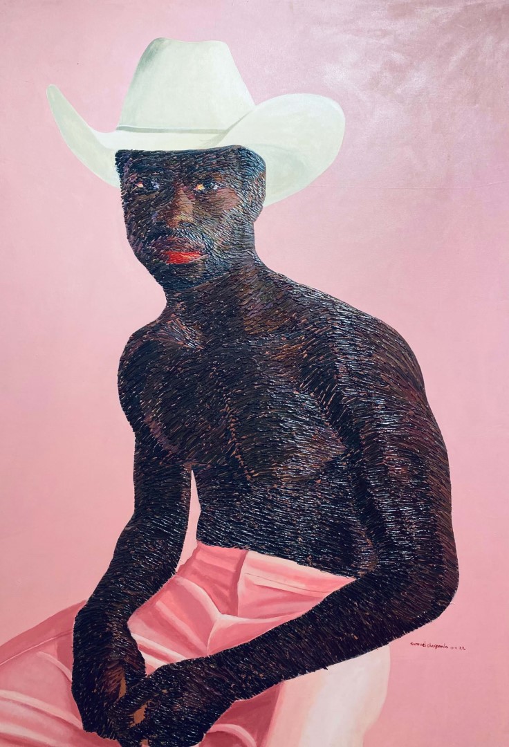 In Olayombo’s inaugural exhibition, Black figures are clothed in an array of rose-coloured clothing and Stetsons, which the artist presents to discuss masculinity and societal gender assertions and associations.